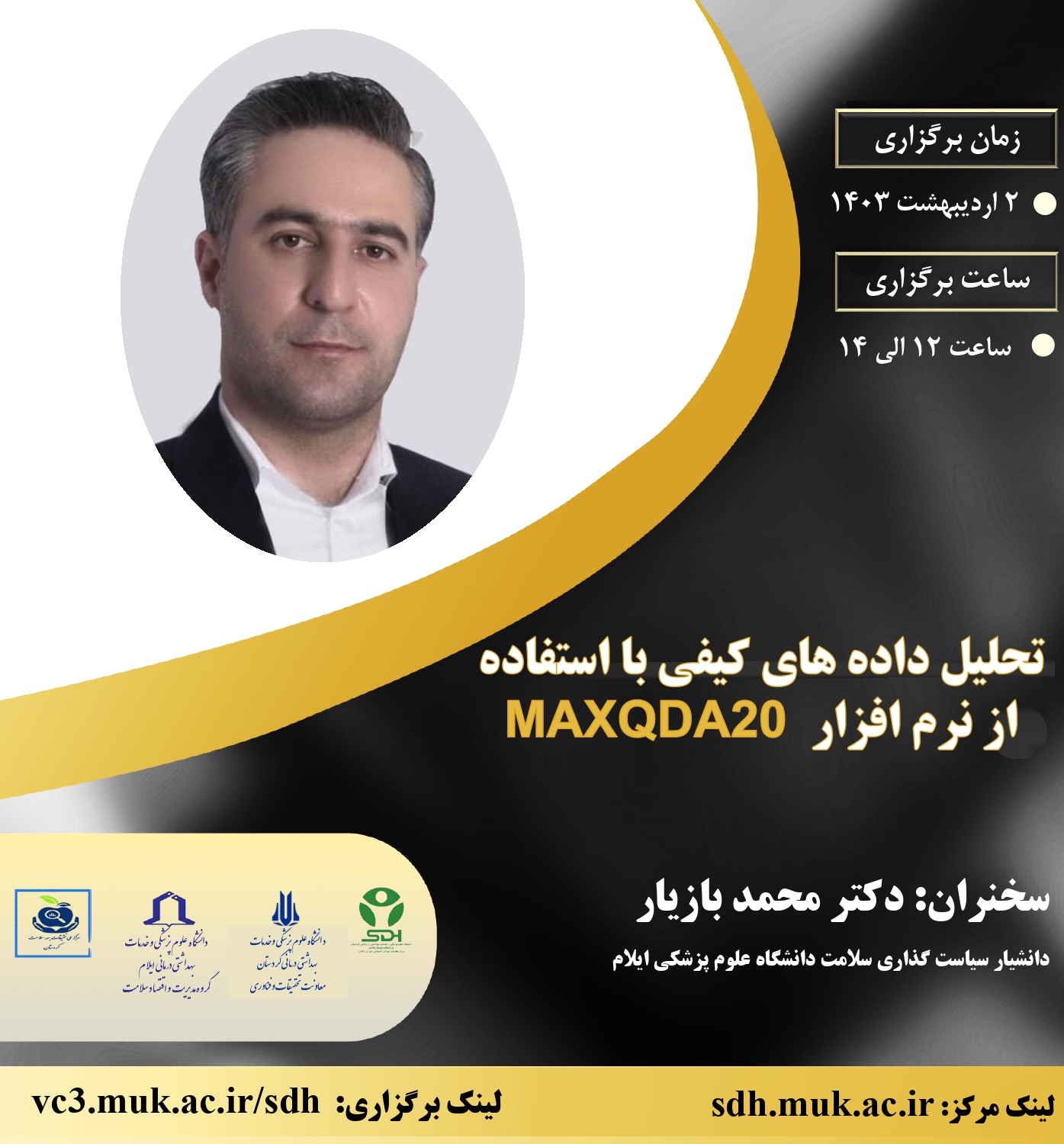 🔘 تاریخ برگزاری: یکشنبه 2 اردیبهشت 1403 🔘 ساعت برگزاری: 12 الی 14 🔘 سخنران: دکتر محمد بازیار ( دانشیار سیاست گذاری سلامت دانشگاه علوم پزشکی ایلام ) |