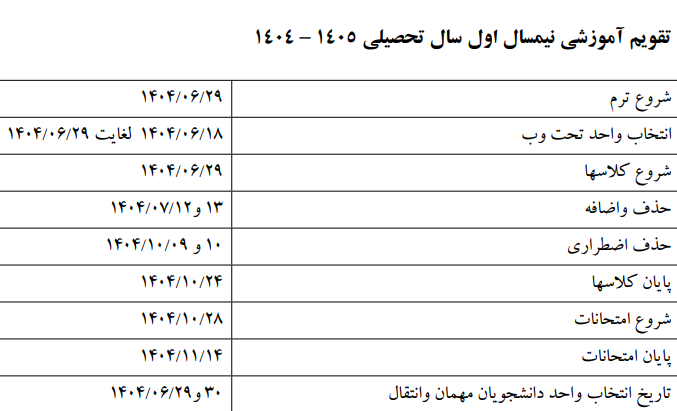 تقویم آموزشی نیمسال اول سال تحصیلی 1405- 1404 دانشگاه