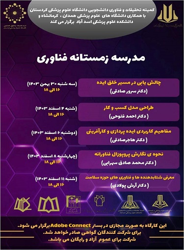 مدرسه زمستانه فناوری توسط کمیته تحقیقات و فناوری دانشجویی دانشگاه علوم پزشکی کردستان و با مشارکت کمیته های تحقیقات و فناوری دانشگاه های علوم پزشکی کرمانشاه، همدان و اسدآباد از 30 بهمن ماه لغایت 11 اسفند ماه 1403در بستر Adobe Connect برگزار خواهد شد.