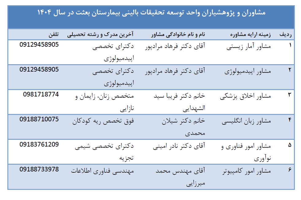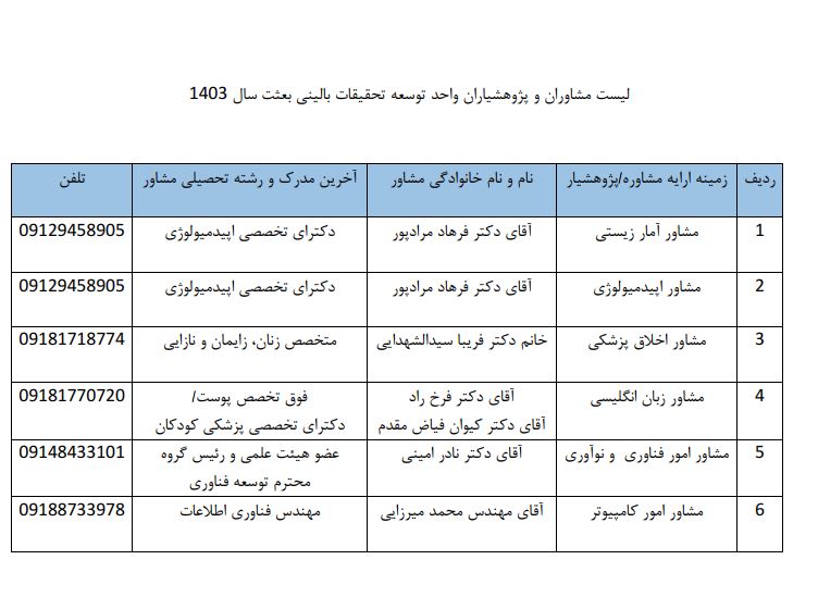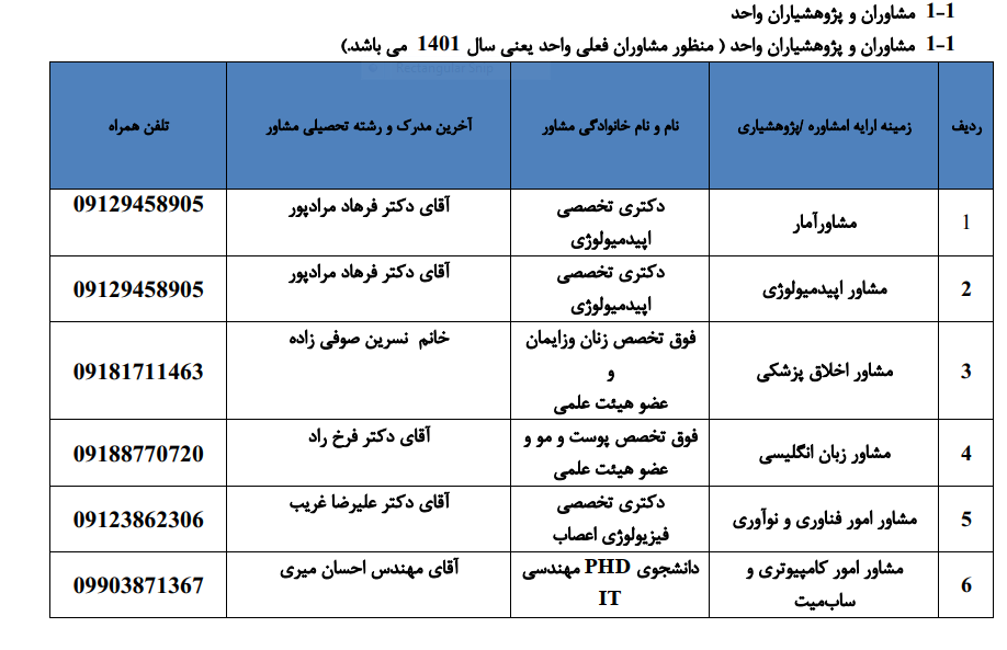 | 1 | مشاور آمار | آقای فرهاد مرادپور | دکترای تخصصی اپیدمیولوژی | 09129458905 |